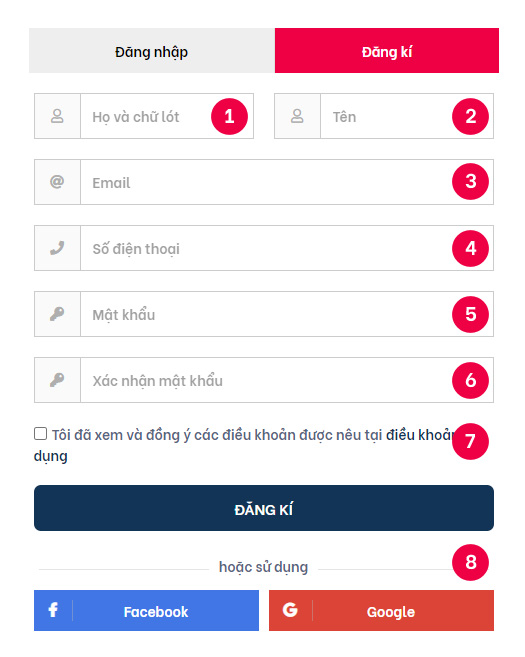 - 8 Đăng nhập sử dụng mạng xã hội: ngoài việc điền thông tin như các bước trên, bạn cũng có thể đăng kí và đăng nhập sử dụng Facebook, Google. Nhấp vào một trong hai nút bên dưới và tiếp tục các bước tiếp theo.