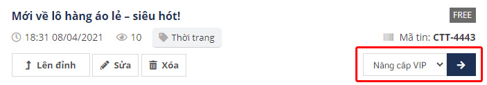 Để đăng tin VIP, bạn chỉ cần đăng tin thông thường trước, sau đó bạn truy cập vào mục Quản lí tin, bạn sẽ thấy mục “Nâng cấp VIP” trên mỗi tin đăng như hình dưới: